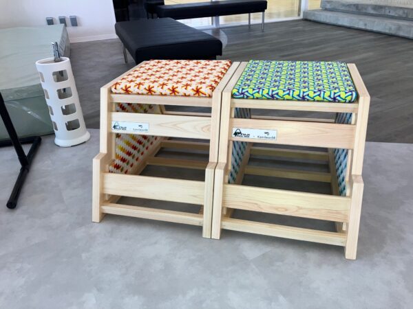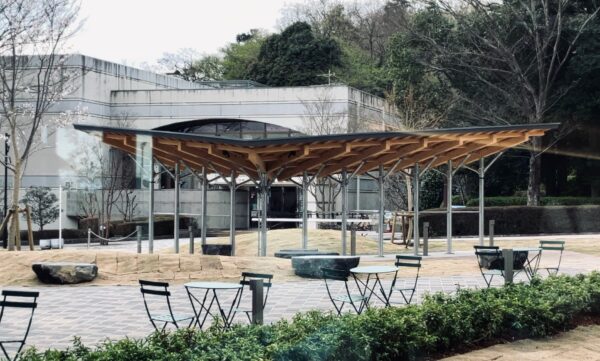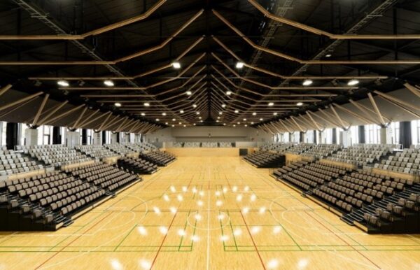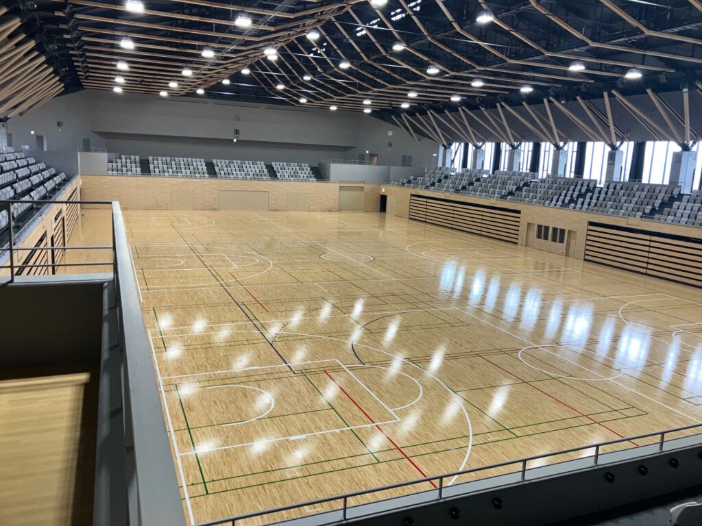 アリーナーの鉄骨の梁1本1本に木を被せてあります。